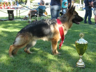 V1 Faberge von Wilhendorf, SchH2, KKL1-a(f. normal). Faberge has won many classes at all levels and is always one of the best females at the Sieger Shows in protection. More importantly, she is the mother of 2007 NASS Puppy Siegerin and Sieger, Bischka and Brunno von Wilhendorf. "Fabi" is out of 2X World Sieger Larus v Batu and North American Siegerin Whitney aus Agrigento.